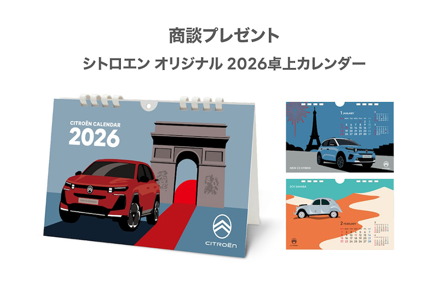新しいデザインを纏う話題のニューモデルと、歴史に名を刻む往年の名車。シトロエンのふたつのユニークな魅力を、カラフルなカラーのイラストで描き起こした2026年オリジナルカレンダーです。月をめくるたびに、シトロエンの楽しさが広がります。